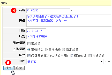 - 上傳權限: 開放或指定成員上傳相片