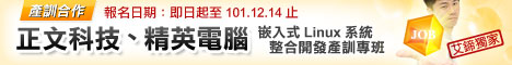 為積極培養具系統整合及系統開發能力之嵌入式系統領域之研發人員,正文科技、精英電腦與艾鍗學院共同合作「嵌入式Linux系統整合開發產訓專班」,本專班最大特色在於課程內容乃針對合作廠商用人之職能需求設計規劃,期能在訓後培養出具備即戰力之研發人員,讓有志投入嵌入式系統領域的您,順利加入合作廠商的研發團隊!